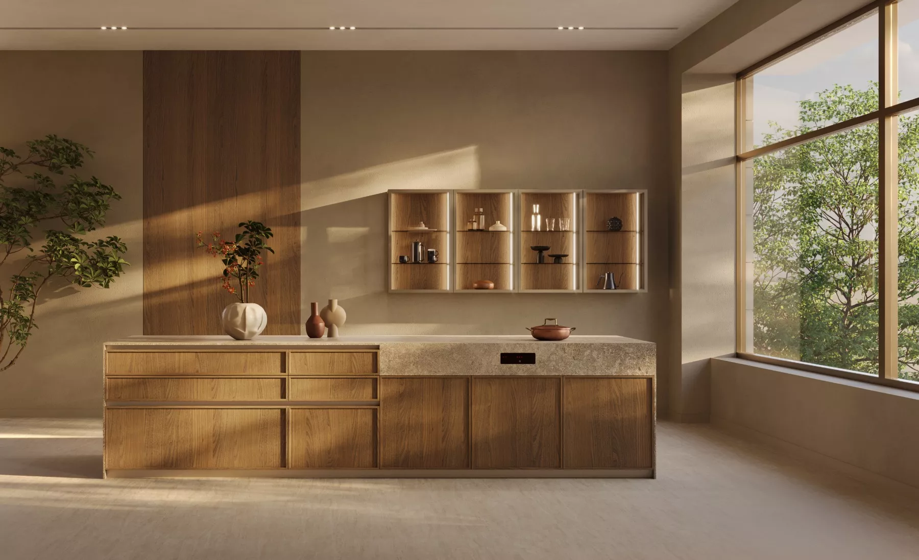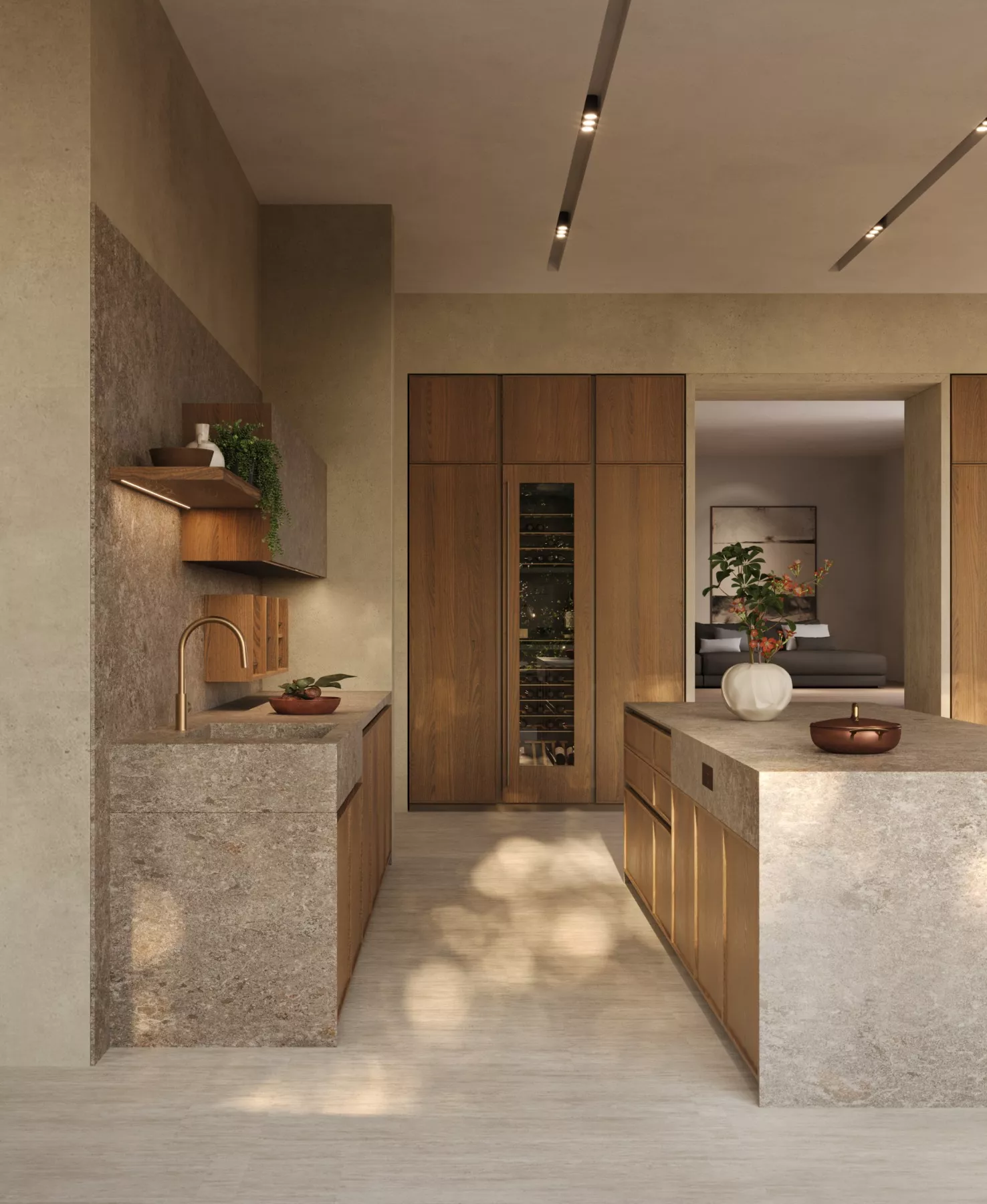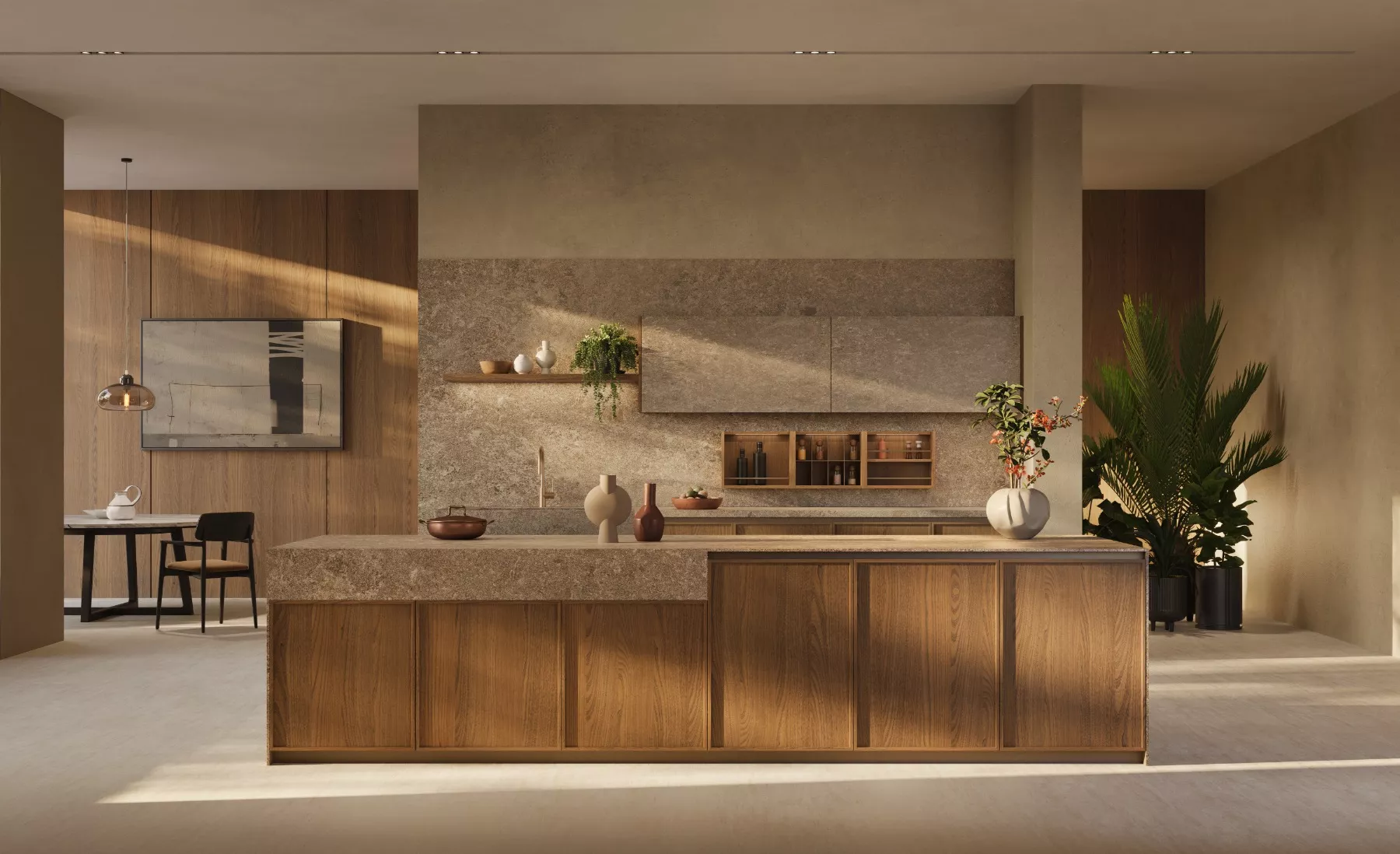 Its atmosphere is warm and sophisticated, blending European charm with a relaxed, livable elegance through soft lighting, natural textures, and gentle contrasts work together to shape an inviting and refined kitchen.