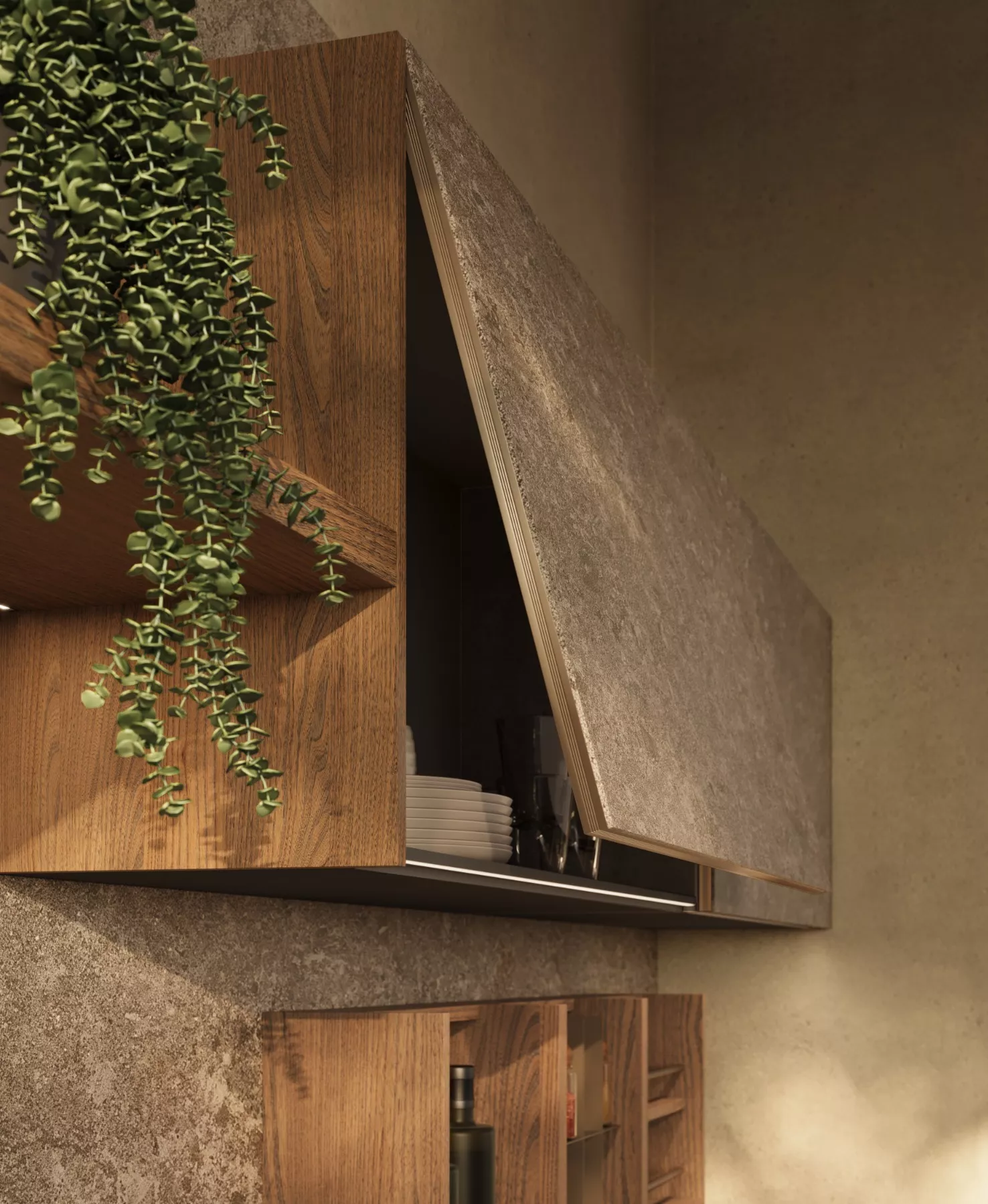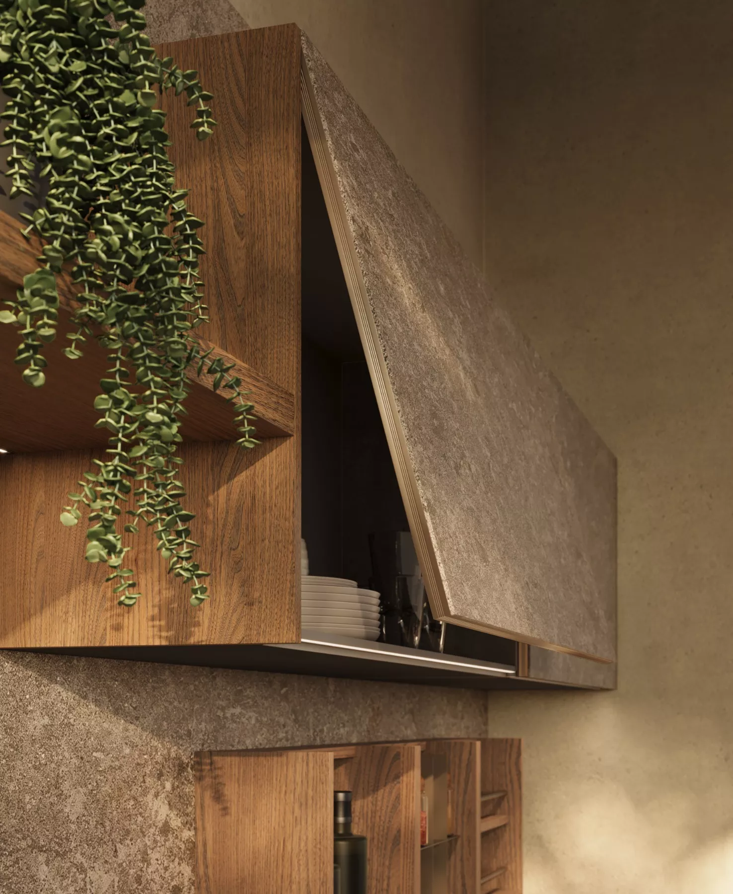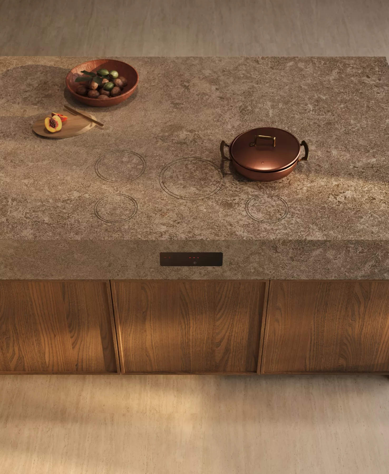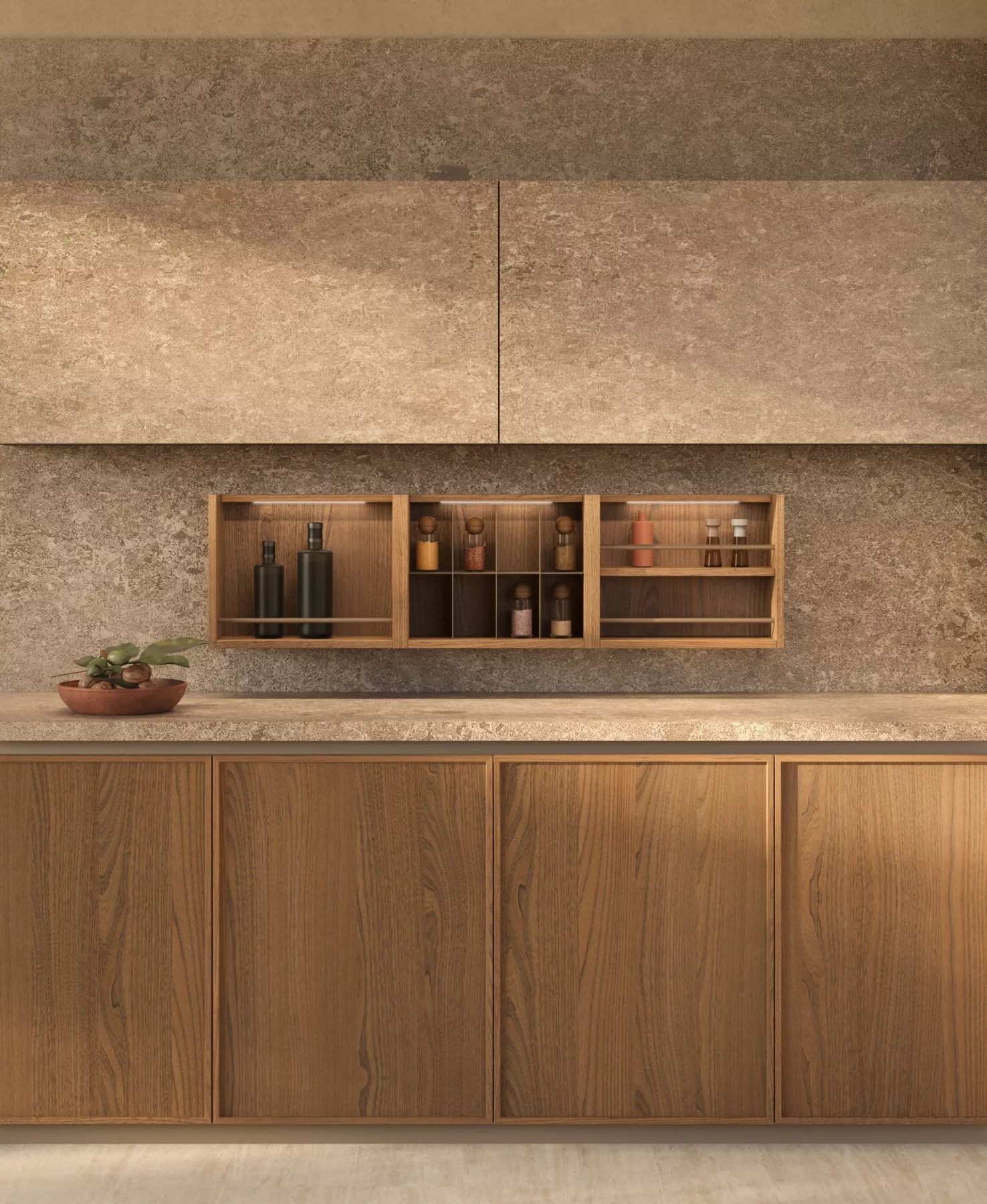 Its atmosphere is warm and sophisticated, blending European charm with a relaxed, livable elegance through soft lighting, natural textures, and gentle contrasts work together to shape an inviting and refined kitchen.